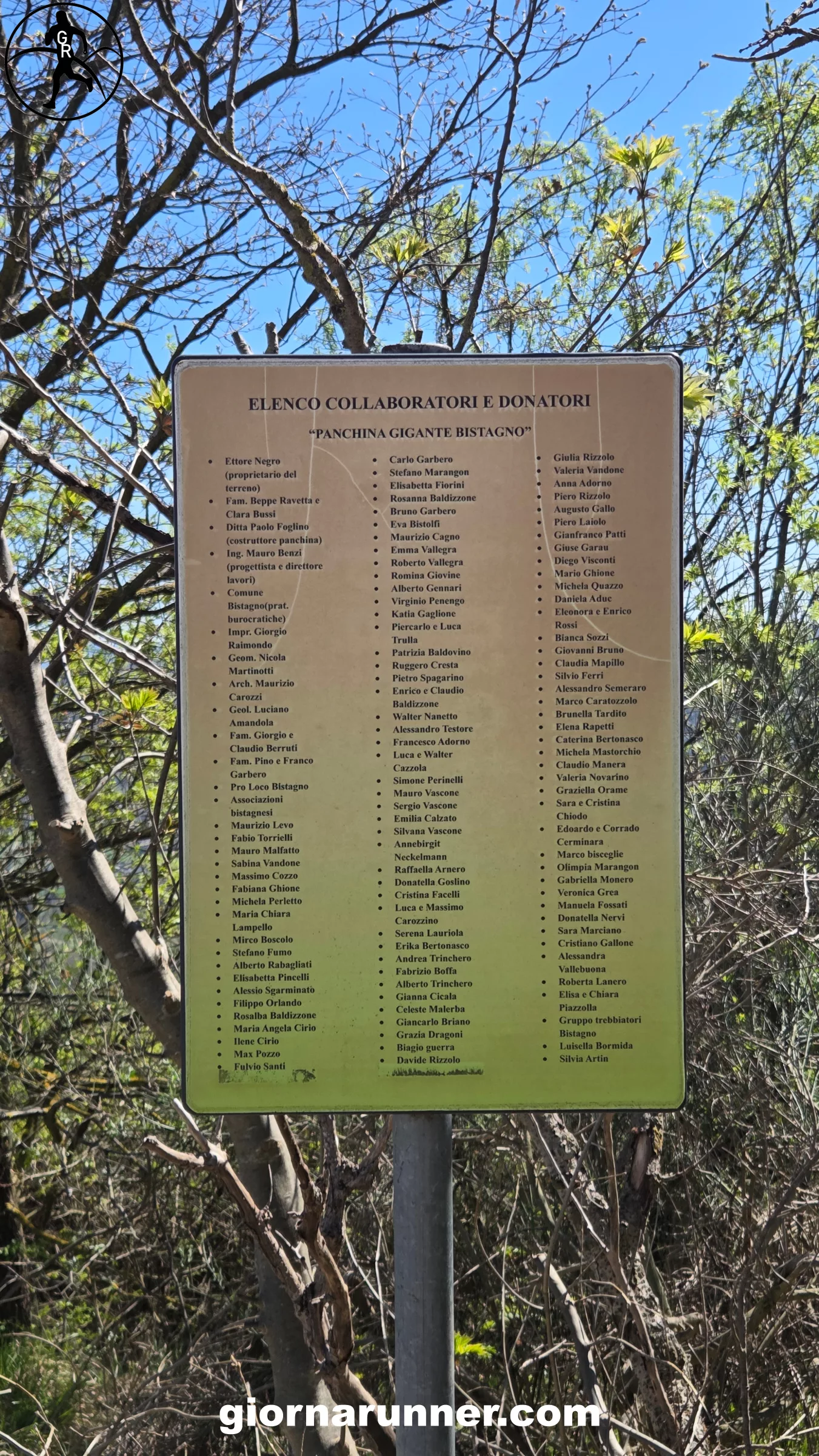Un’altra cosa che mi ha colpito è lo spirito di comunità dietro questa panchina: nel sentiero per arrivarci c’è un pannello con la lunga serie di persone che hanno contribuito all’installazione. Scorrendo la lista ho trovato pure qualche nome che conosco… ovviamente legato alla corsa!