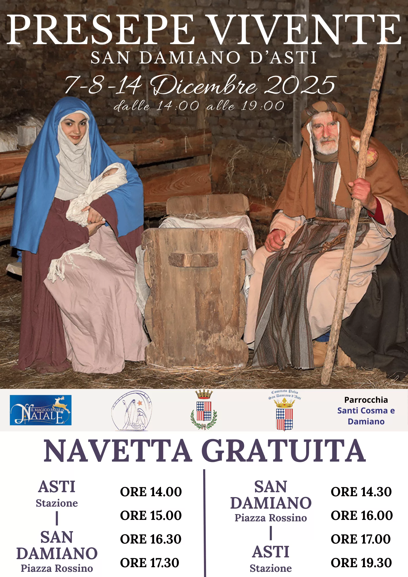 Per agevolare l’arrivo dei visitatori, nelle giornate del Presepe Vivente sarà attivo un servizio navetta gratuito da e per Asti con i seguenti orari: